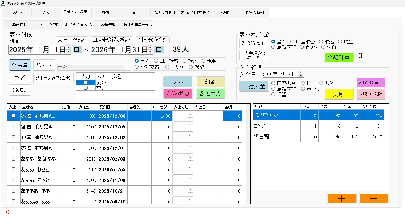 薬局ならではの未収金を一覧で把握し、確認漏れを防ぎます。未収金患者をリスト化し、当日の会計画面で未収金分を合算して処理できるため、処理漏れを未然に防ぎやすくなります。選定療養費など確認が必要なケースも想定し、回収業務が属人化しにくい運用を支えます。