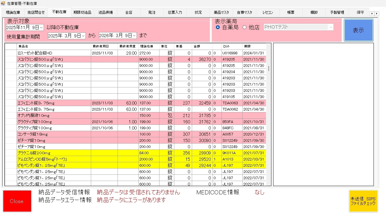 指定した期間で動いていない医薬品を抽出し、滞留在庫を早めに把握できます。該当医薬品を使用しているグループ店も同時に確認できるため、店舗間での在庫調整や活用判断がしやすくなります。気づいた時には期限が迫っていたという状況を減らし、在庫の鮮度と回転を保つ運用に役立ちます。
