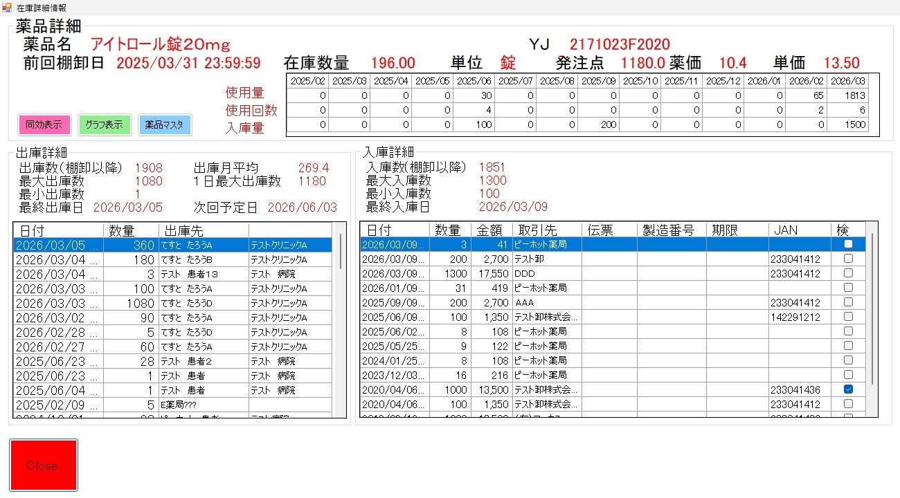 在庫詳細を見える化し、発注点切れや過剰在庫の医薬品を分かりやすく把握できます。在庫推移をグラフで確認できるため、増減の傾向がつかみやすく、発注判断の迷いを減らします。同効品も表示できるので、代替候補の検討にもつながります。日々の確認作業を短縮し、欠品と過剰の両方を抑える基盤になります。