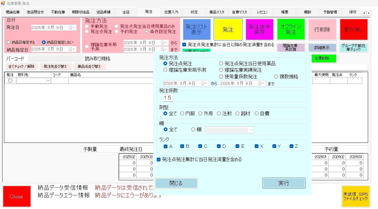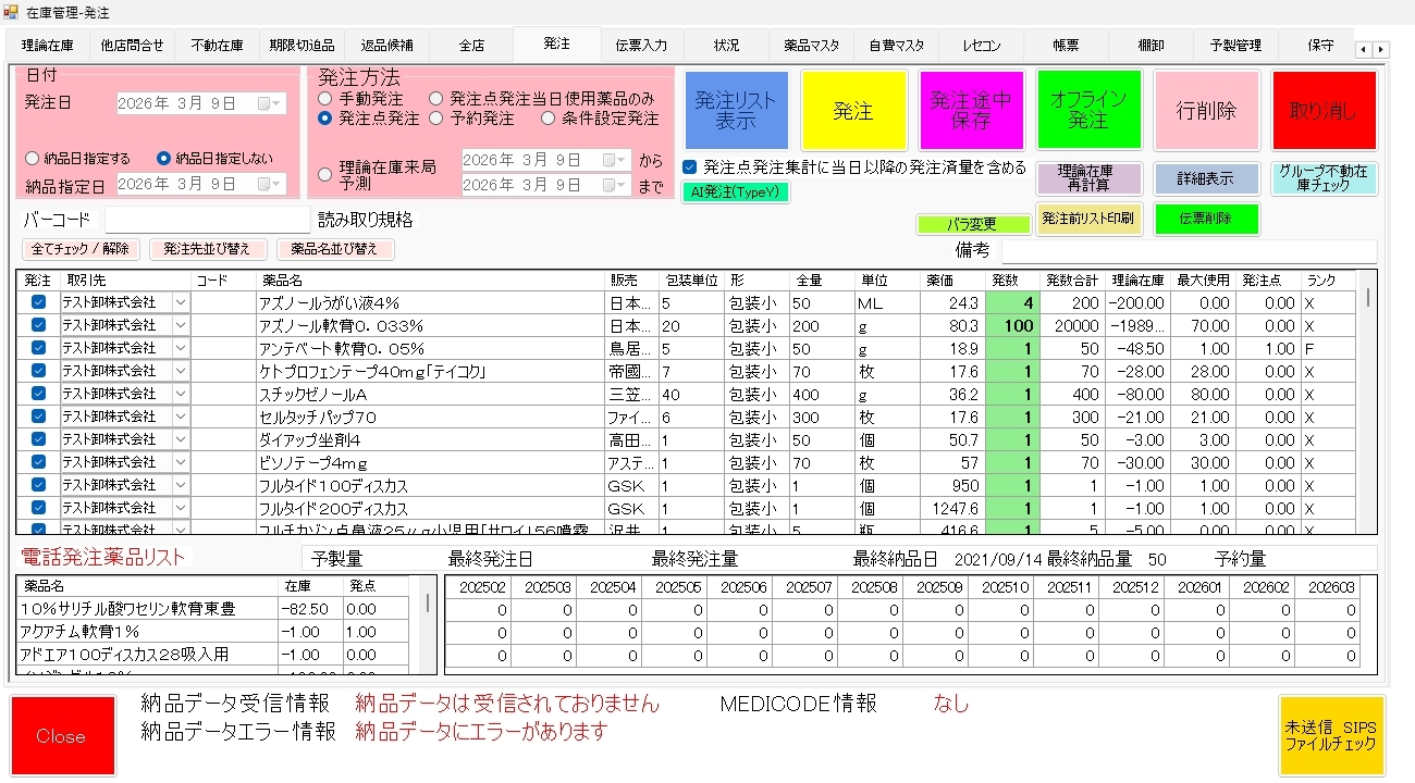 発注点と処方データをもとに、必要数量の算出を支援します。多彩な発注方法を備え、複雑な手順を増やさず、必要な医薬品を必要な数量でリストアップします。手動発注に加え、発注点切れ発注、当日使用薬品向けの発注点切れ発注、予約発注、来局予測発注に対応します。発注にかける時間と回数を減らし、忙しい中でも判断がぶれにくい流れを作れます。
